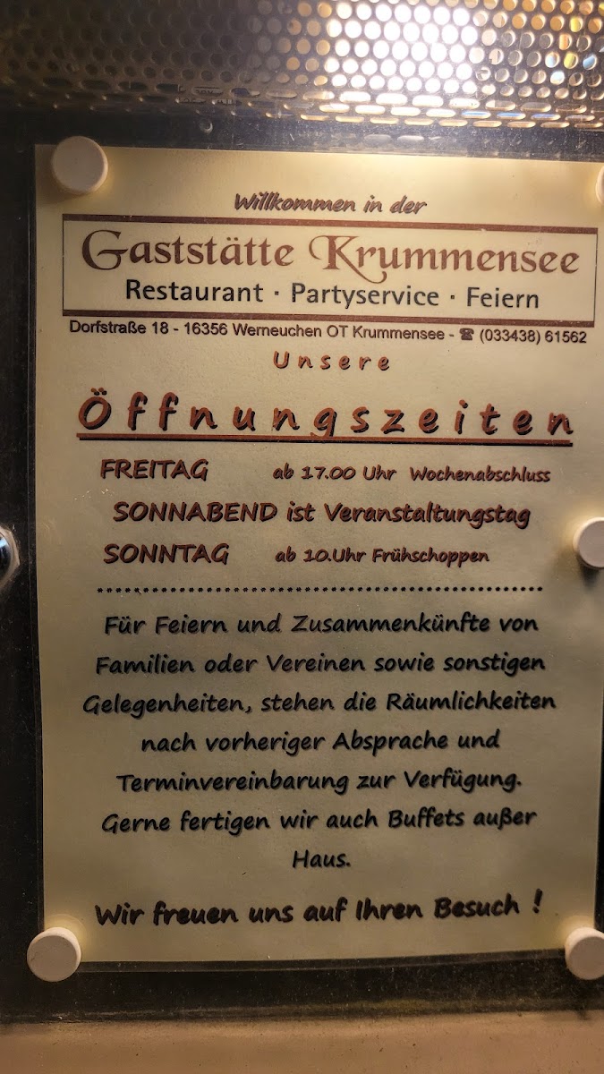 Welcome to Gaststätte Krummensee, a hidden gem nestled in the heart of Werneuchen, Germany. With its inviting atmosphere and superb culinary offerings, this establishment is perfect for hosting memorable gatherings. Located at Dorfstraße 18, it has become a popular choice for festive occasions, evidenced by rave reviews from delighted patrons.